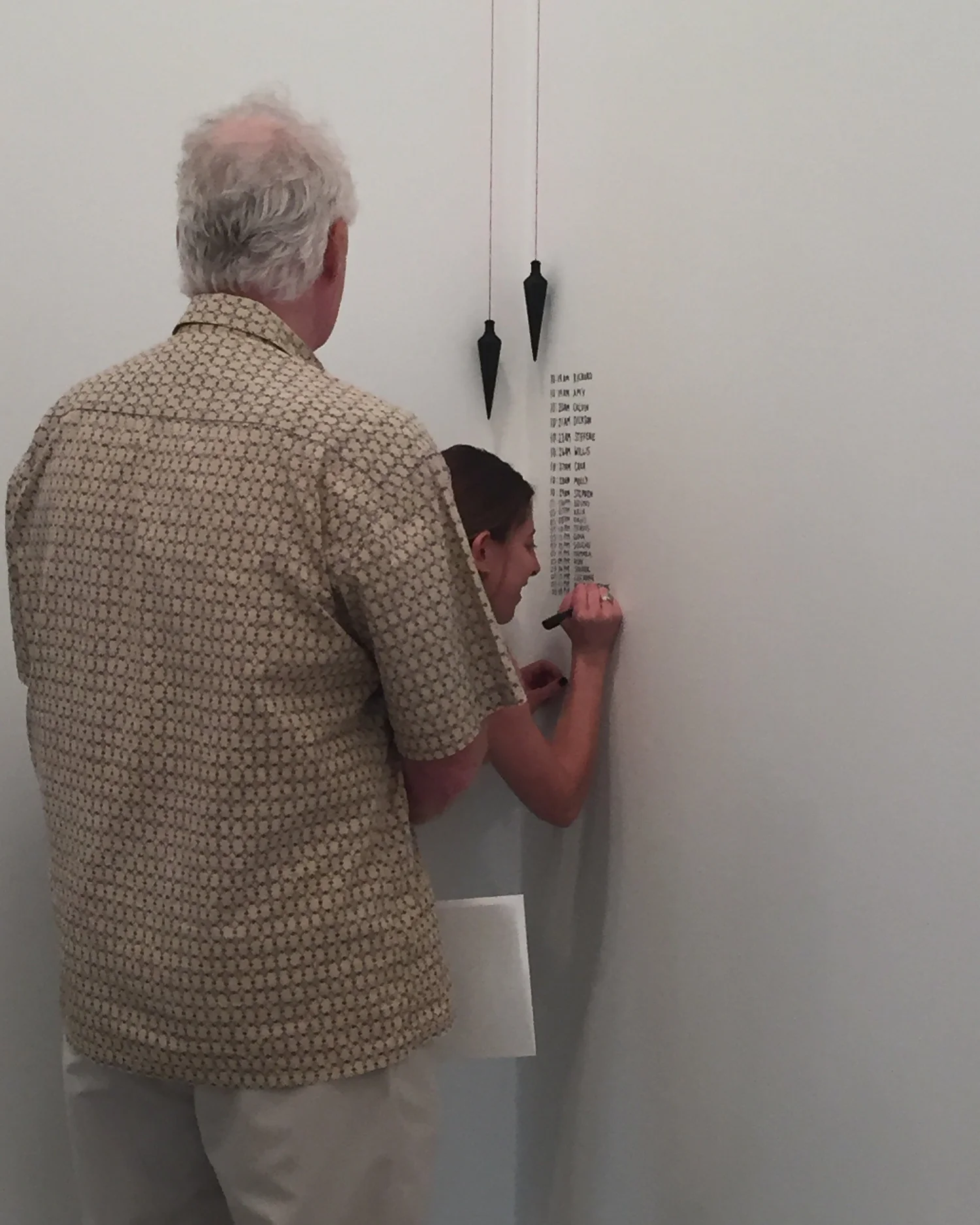In the main gallery, Janet Cardiff’s The Forty Part Motet channeled the voices of forty choral singers into separate audio speakers; as listeners moved through the space, the shape of the music varied from individual voices to a polyphonic confluence of sound. Elsewhere, visitors were encouraged to have their names inscribed directly onto the gallery wall for Roman Ondák’s performance Clockwork, which retained the written memory of those who took part in it. Felix Gonzalez-Torres’s “Untitled” (Placebo-Landscape-for Roni) comprised hard candies to be removed and eaten, depleting and dispersing the work over time.
