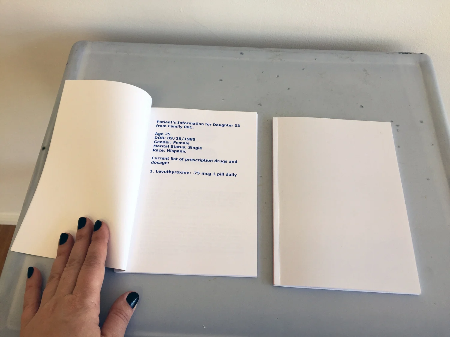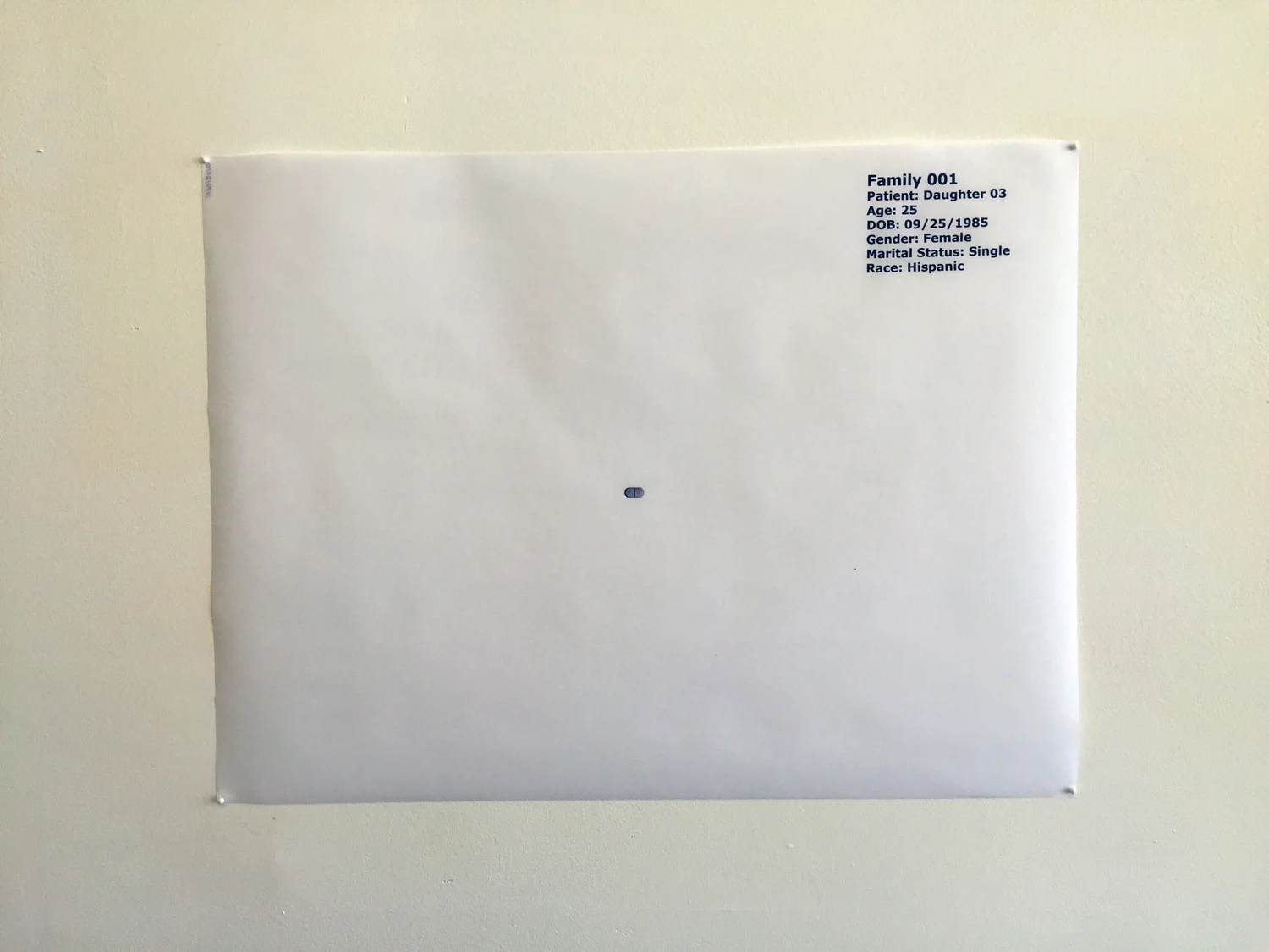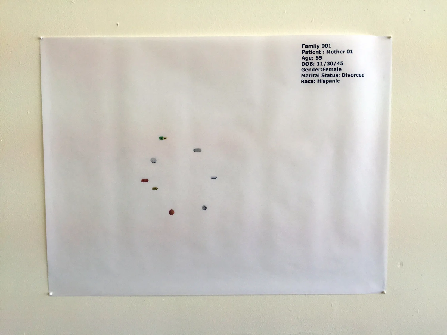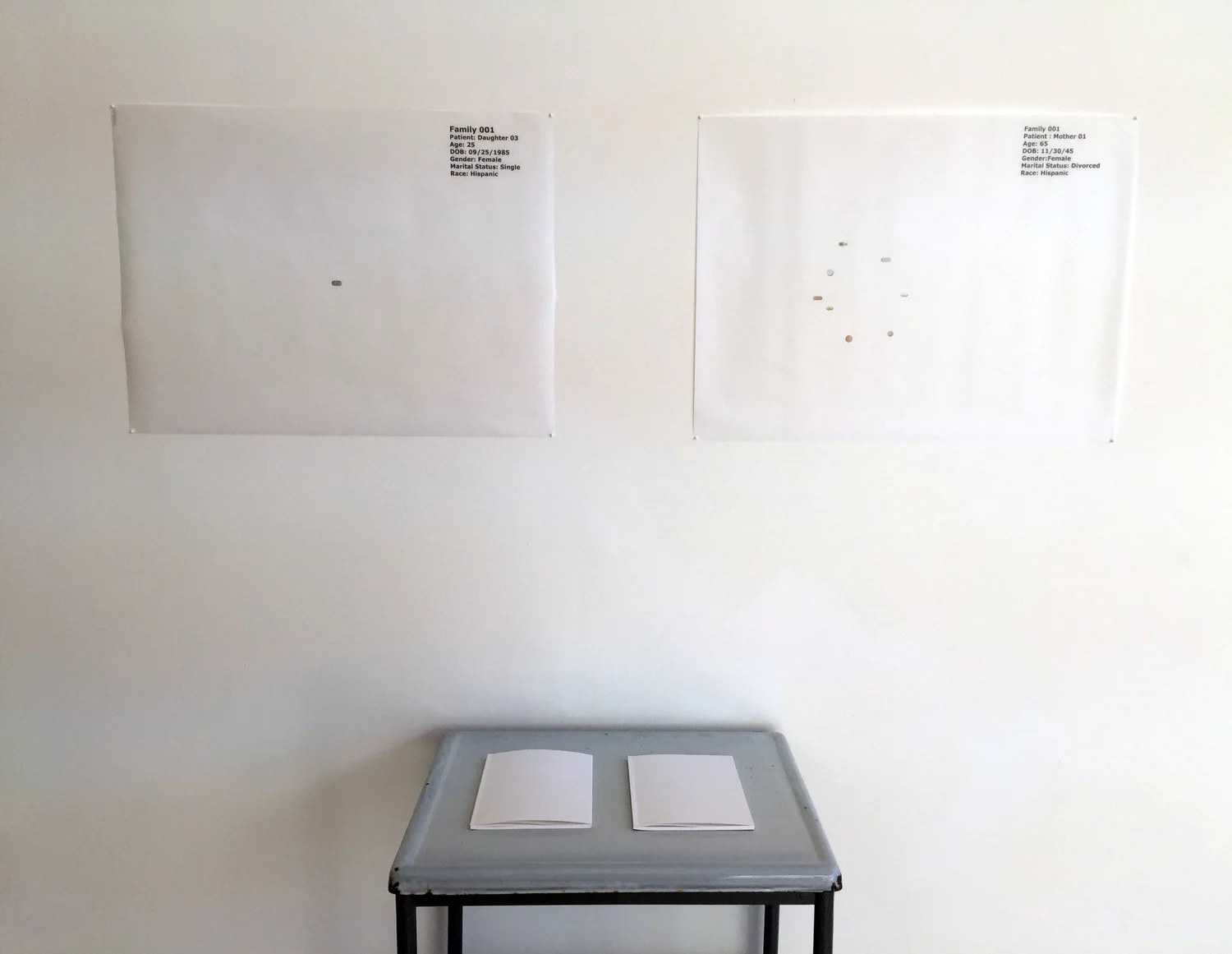 The maternal relationship is one fraught with complications that are relational and ever-changing. This exhibition examined the ways that dependency and responsibility between mother and child can shift through circumstance and time. Each artist considered the absence of the mother’s body and ruminated on themes of love, disdain, and mortality in works created specifically for this exhibition. Lauren Cardenas createed “prints” by asking her mother to sleep on top of thin sheets of paper, leaving behind the residue of her rest—namely sweat, saliva, chocolate, and Capri menthol 100s. Nic King Ruley neutralized the personal signifiers of his mother’s body by creating a sculpture with her image, her urine, and the sound of her heartbeat. Karol Shewmaker charted a year spent with her mother in the pages of a book that begin the day following her father’s death. Within these very personal works, the artists contend with how identity is conflated and separated from the mother by engaging non-traditional materials and meticulous acts of making.